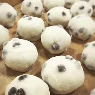 きねでついたやわらかいお餅に、蒸したエンドウ豆を混ぜ、自家製つぶあんをたっぷり包みました。 甘さ控えめ、歯ごたえあり、のびがいい!! 毎月29日だけの限定商品です。