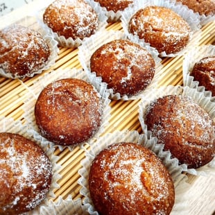 自家製こしあんをドーナツ生地で包み、国産の米ぬかから作られたこめ油で揚げ、グラニュー糖をまぶしました。 すぐに食べるとカリッ、しばらくおくとしっとり、食べごろ食感はお好みで!! 毎月9日だけの限定商品です。