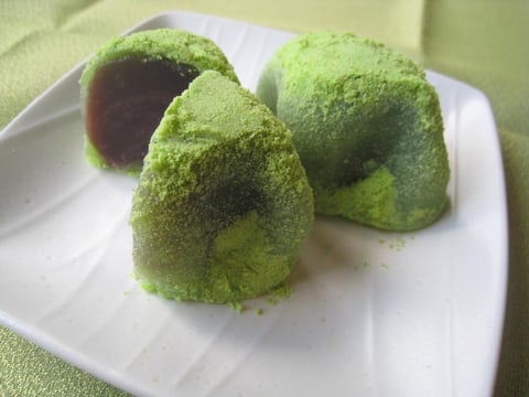 十勝小豆を使用したこしあんを求肥で包み、端をつまんで「うぐいす型」に仕上げ、うぐいすきな粉をまぶしました。