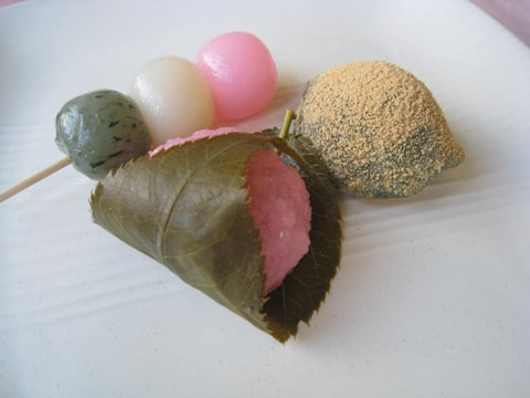 花見団子・・・紅は桜で春を、白は雪で去りゆく冬を、緑はやがて来る夏を表しています。秋がないことから「飽きない」という言葉遊びも・・・ 桜餅・・・関西で主流の、道明寺粉の皮でこしあんを包み、塩漬けした桜の葉をつけました。桜の葉も一緒にお召し上がりいただけます。 草餅・・・十勝小豆を使用した粒あんを、香りの良いよもぎたっぷりの生地で包み、きな粉をまぶしました。