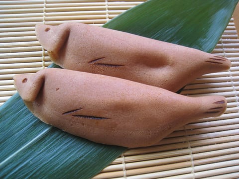 清流を泳ぐ鮎の形をした夏の和菓子。やわらかい求肥を、ほんのり香ばしくふんわりやわらかに焼き上げた生地で包み、形を整え焼きごてで目やヒレなどを入れました。