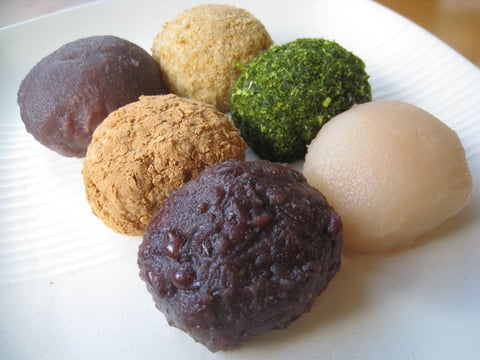 定番のつぶあん、きなこに加え、前もってご注文を頂きますと、こしあん、白あん、青のり、白ごまもご用意させて頂きます。それぞれの味、是非ともお試しください。